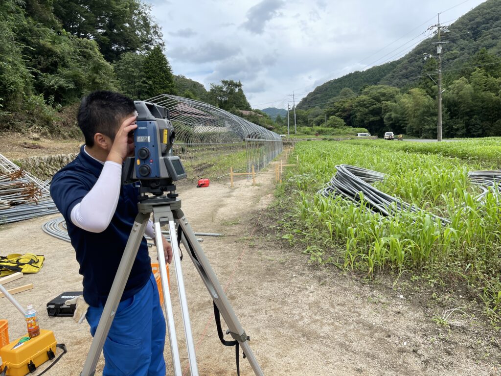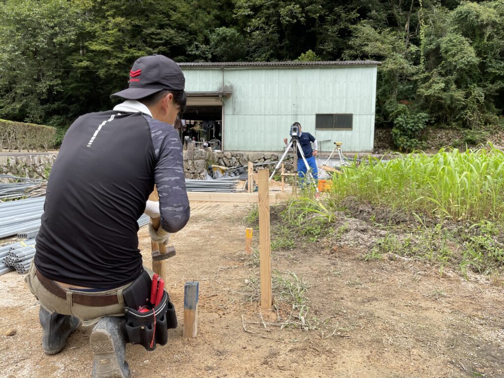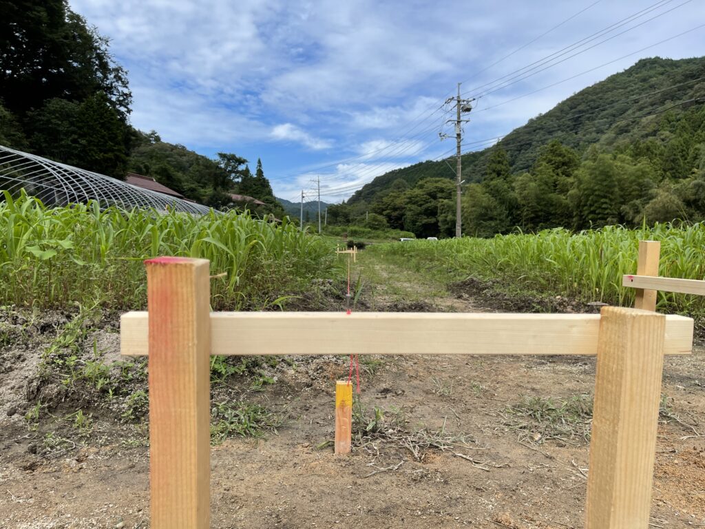 長いハウスになるので、水糸がたるまないよう15mの間隔で丁張を設置していきます。