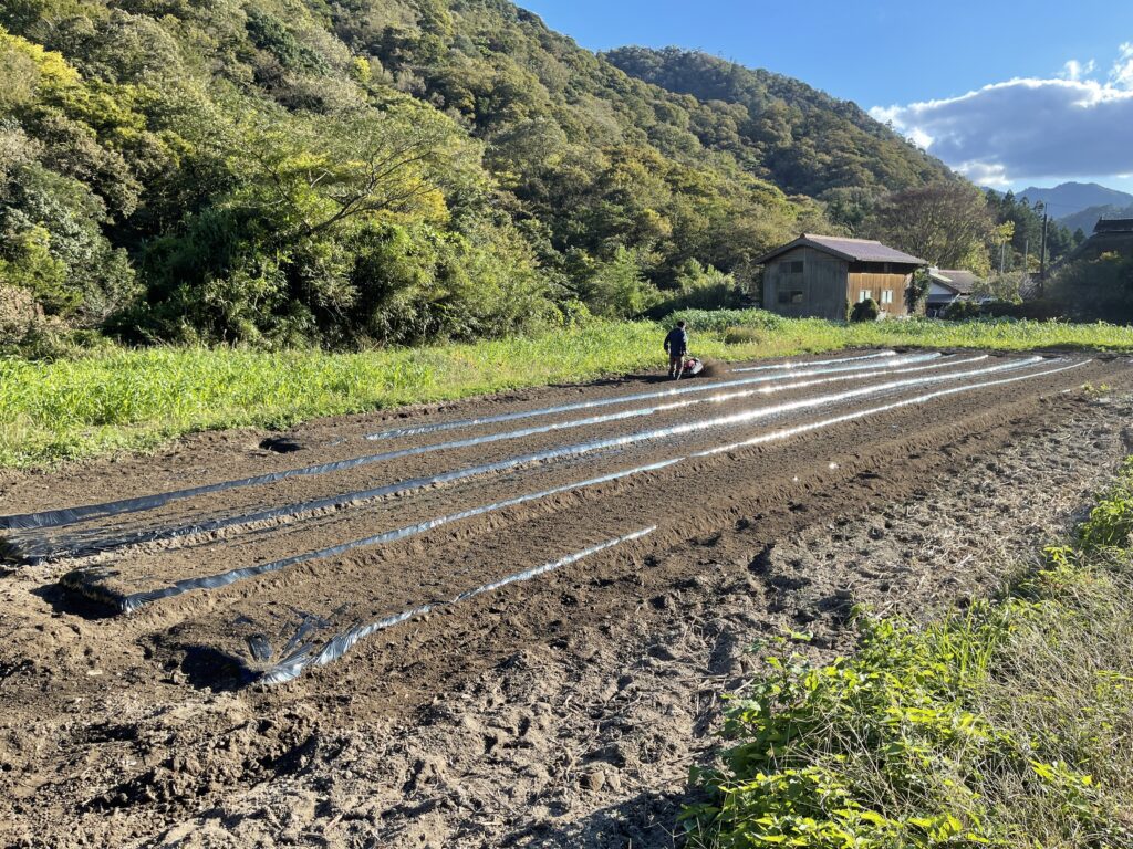 前回マルチを張った畑にニンニクを植え付けていきます。