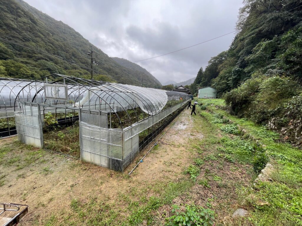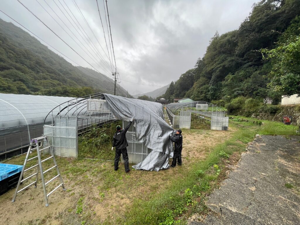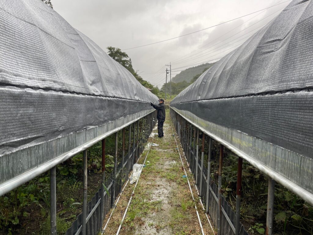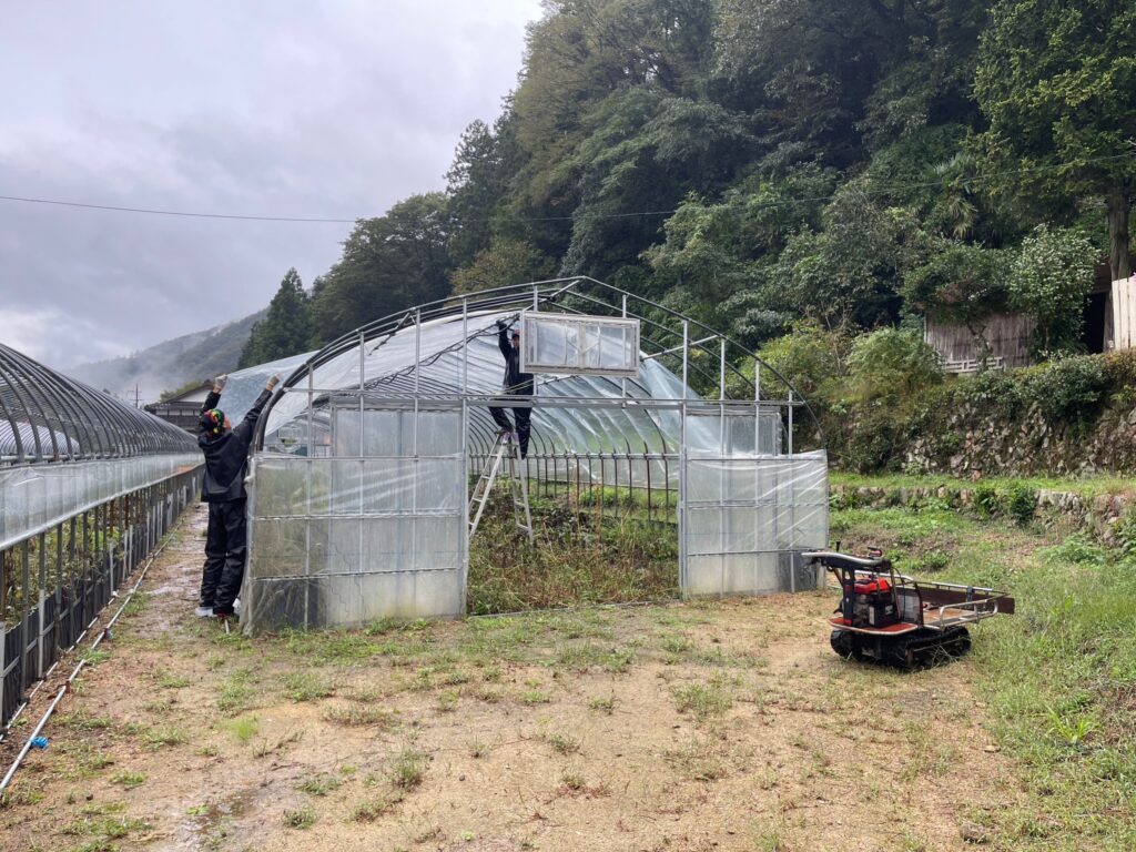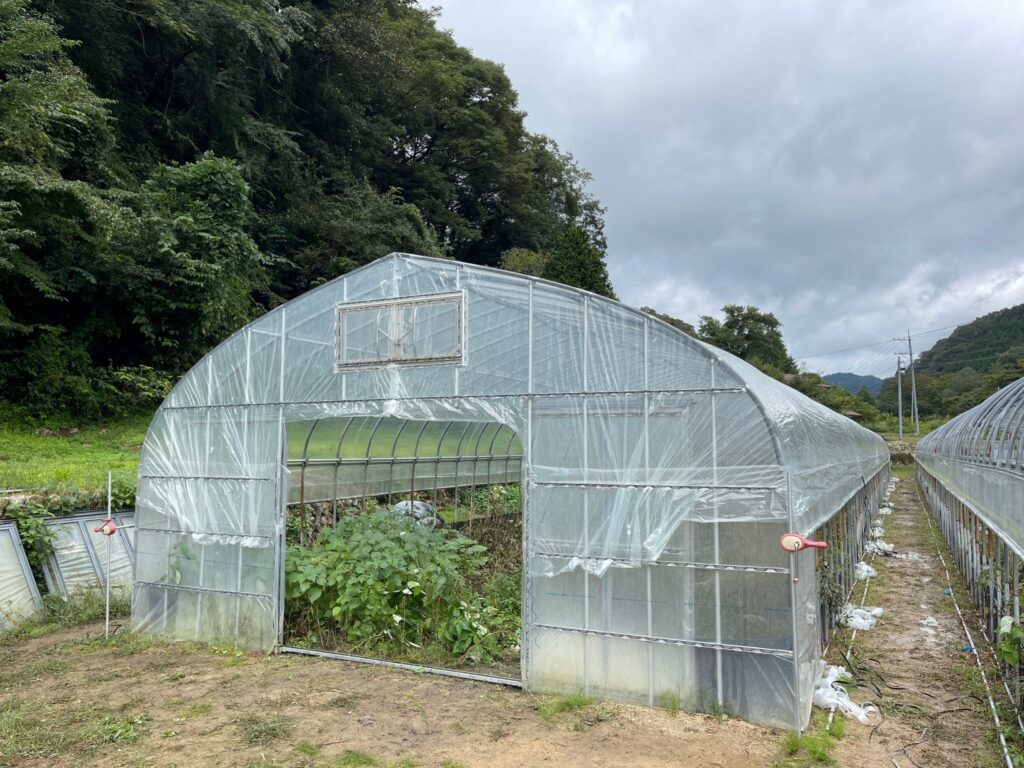 次にビニールシートをハウスの両端まで広げ反対側から引っ張ります。