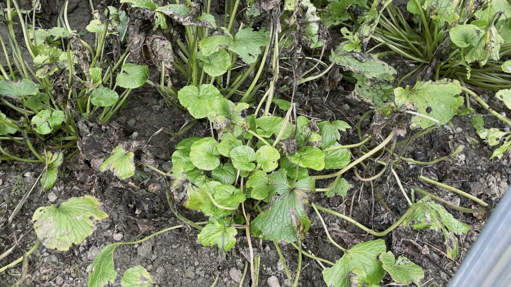 暑さでわさびもダメージを負ってはいますが、根元には次の葉が控えていて、株はしっかりと生きています。
