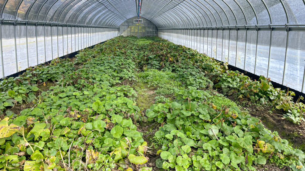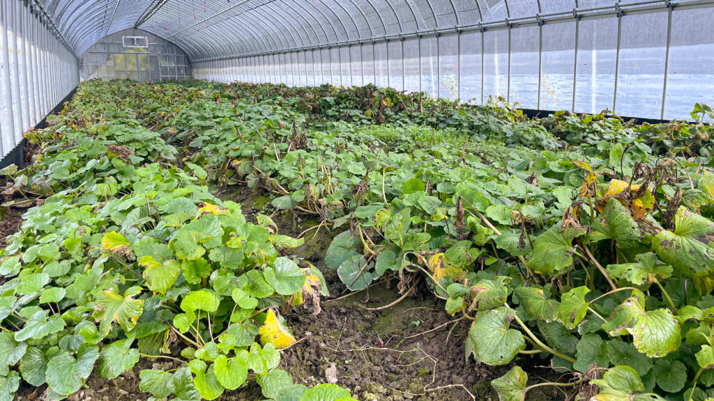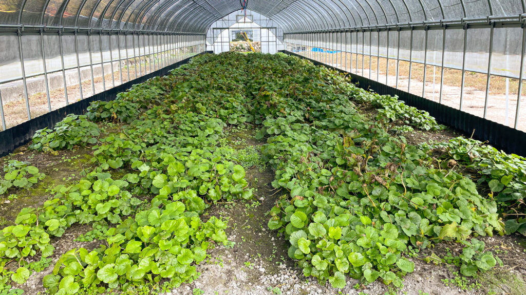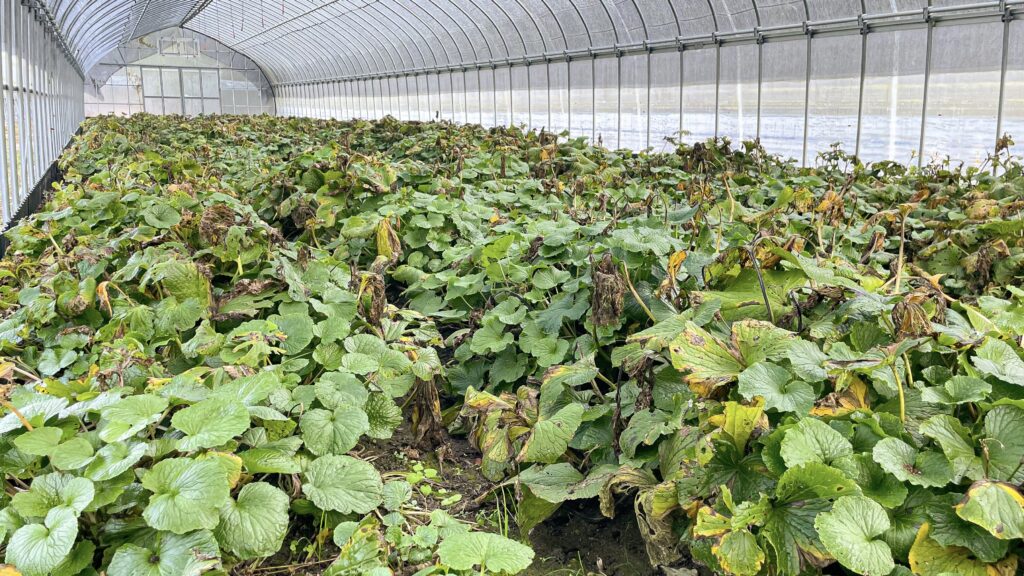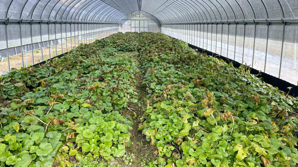 前回の投稿では、傷んでいた夏葉が目立っていましたが、ハウス内はすっかり青くなりました。