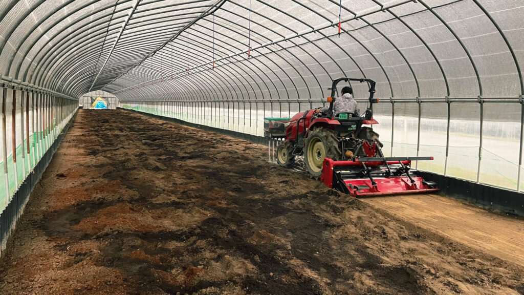 持ち帰った牛糞と完熟堆肥、石灰を散布し鋤き込みます。
